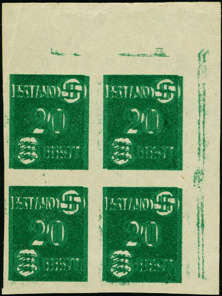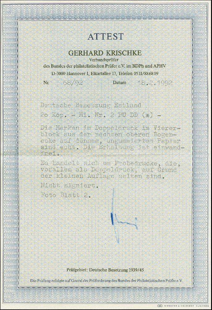 | Zusatzinformationen und Suchstichworte: | 383. Auktion Heinrich Köhler 14.–15. & 18.–23. März 2024 Los 3065 Deutsche Besetzung II. WK Estland 1941, 20 K. grün, ungezähnter Probedruck-4er-Block aus der rechten oberen Bogenecke mit Doppeldruck, ohne Gummi wie verausgabt, tadellos, leicht schräger Bug oben links das Markenbild nicht berührend Ausruf 250,00 EUR |