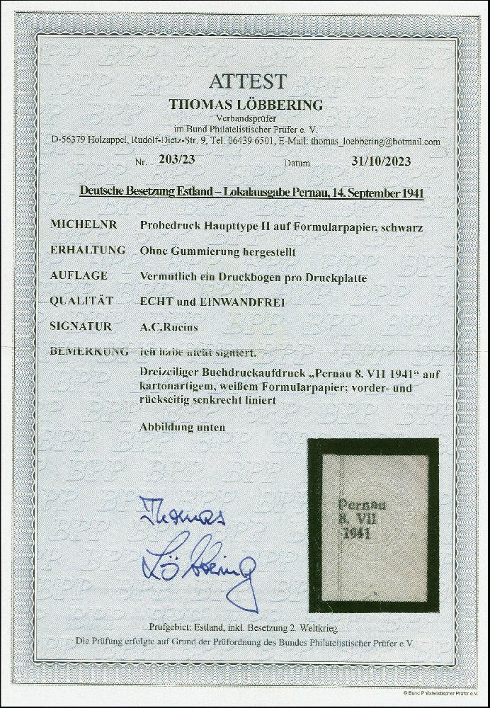 | Zusatzinformationen und Suchstichworte: | 383. Auktion Heinrich Köhler 14.–15. & 18.–23. März 2024 Los 3069 Deutsche Besetzung II. WK Estland Lok Pernau Probedruck in Type II auf Formularpapier, ungummiert, tadellos Ausruf 100,00 EUR |