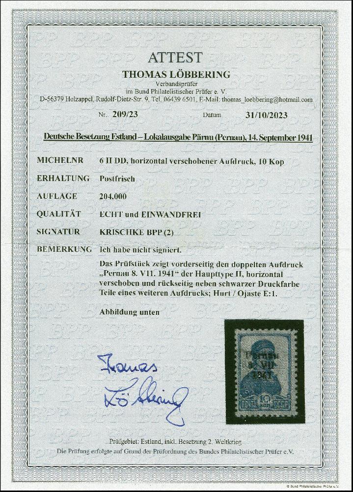 | Zusatzinformationen und Suchstichworte: | 383. Auktion Heinrich Köhler 14.–15. & 18.–23. März 2024 Los 3074 Deutsche Besetzung II. WK Estland Lok Pernau 10 K. mit sehr leichtem doppelten Aufdruck, rückseitig großflächig schwarze Druckfarbe, sauber ungebraucht, tadellos Ausruf 100,00 EUR |