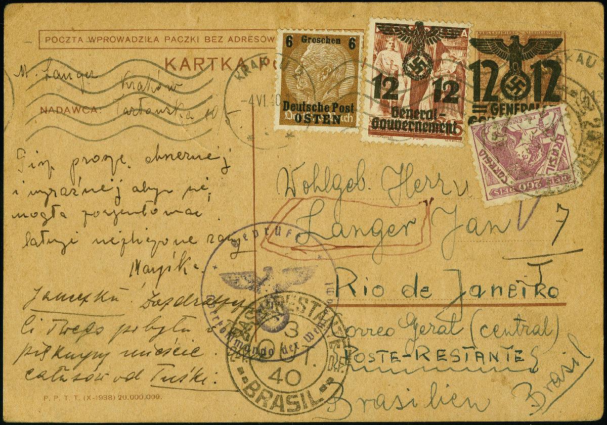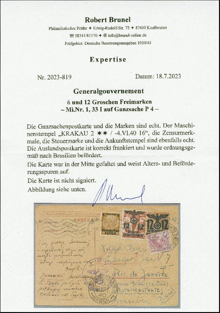 | Zusatzinformationen und Suchstichworte: | 383. Auktion Heinrich Köhler 14.–15. & 18.–23. März 2024 Los 3017 Generalgouvernement 1939, 6 Gr. und 12 Gr. als Zufrankatur mit Maschinenstempel "KRAKAU -4.VI.40" auf zensierter Ganzsachenkarte 12 Gr. nach Rio de Janeiro, dort mit Steuermarke 200 R. frankiert, die Karte mittig gefaltet mit Beförderungsspuren, seltene Destination Ausruf 120,00 EUR |