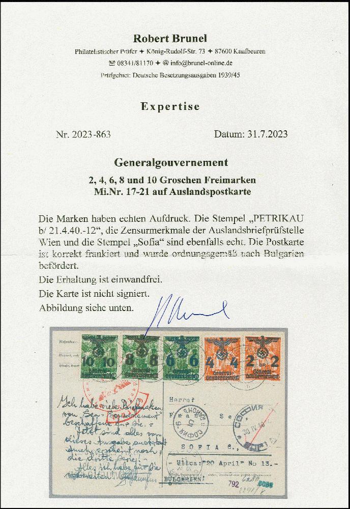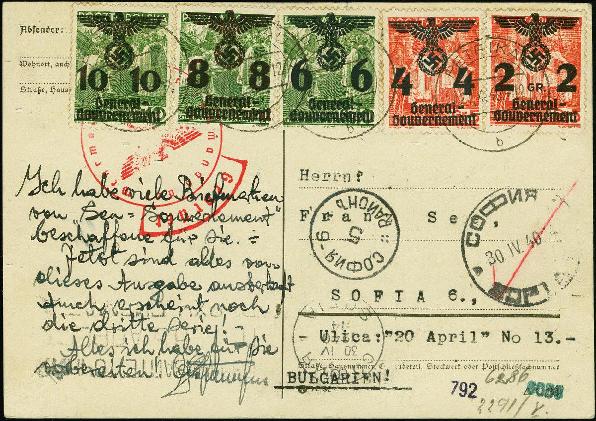 | Zusatzinformationen und Suchstichworte: | 383. Auktion Heinrich Köhler 14.–15. & 18.–23. März 2024 Los 3021 Generalgouvernement 1940, 2-10 Gr. mit Stempel "PETRIKAU 21.4.40" auf zensierter Postkarte nach Sofia, Bulgarien mit Transit- und Ankunftsstempel, tadellos Ausruf 80,00 EUR |