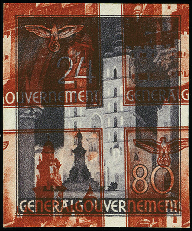 | Zusatzinformationen und Suchstichworte: | 383. Auktion Heinrich Köhler 14.–15. & 18.–23. März 2024 Los 3026 Generalgouvernement 1940, Bauwerke 80 Gr. ungezähnt mit zusätzlichem, stark verschobenem, roten Druckbild des 24 Gr. Wertes, postfrisch, tadellos Ausruf 80,00 EUR |