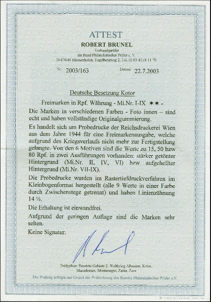 | Zusatzinformationen und Suchstichworte: | 383. Auktion Heinrich Köhler 14.–15. & 18.–23. März 2024 Los 3090 Deutsche Besetzung II. WK Kotor 1944, Unverausgabte mit getöntem und aufgehelltem Hintergrund 10-80 Pfg., 9 Werte in unterschiedlichen Farben, postfrisch, tadellos, selten Ausruf 3.000,00 EUR |