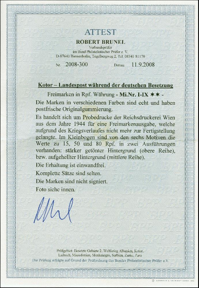 | Zusatzinformationen und Suchstichworte: | 383. Auktion Heinrich Köhler 14.–15. & 18.–23. März 2024 Los 3092 Deutsche Besetzung II. WK Kotor 1944, Unverausgabte mit getöntem und aufgehelltem Hintergrund 10-80 Pfg., 9 Werte in unterschiedlichen Farben, postfrisch, tadellos, selten Ausruf 3.000,00 EUR |
