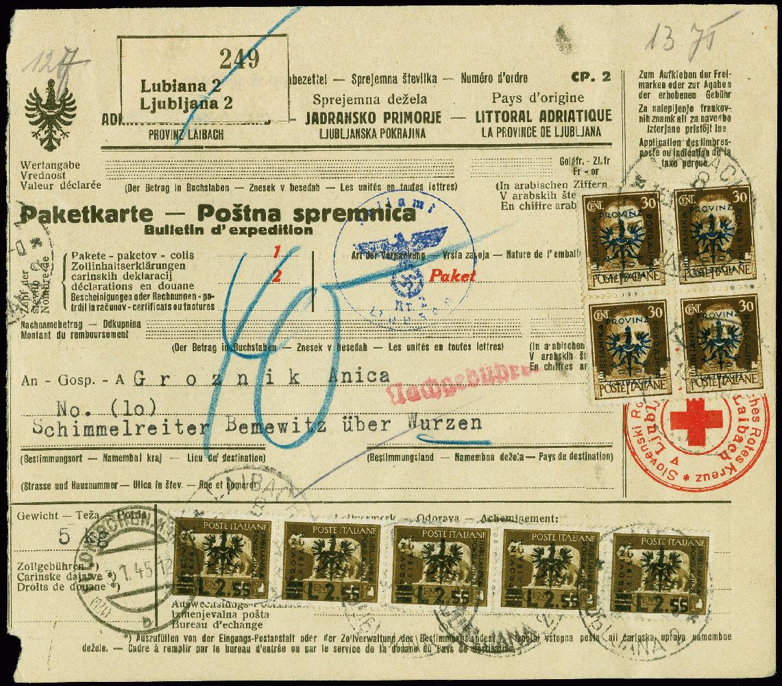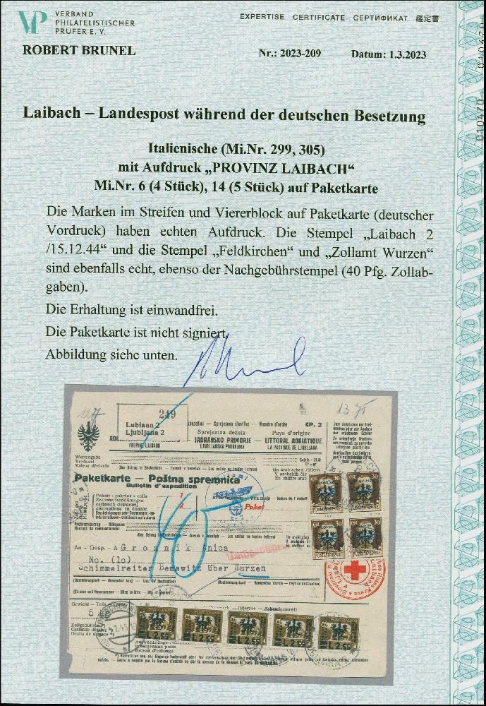 | Zusatzinformationen und Suchstichworte: | 383. Auktion Heinrich Köhler 14.–15. & 18.–23. März 2024 Los 3096 Deutsche Besetzung II. WK Laibach 1944, 2,55 L. im waagerechten 5er-Streifen und 30 C. im Viererblock mit Stempel "LAIBACH 2 15.XII.44" auf Paketkartenach Wurzen mit 40 Pfg. Nachgebühr für die Verzollungsgebühr, tadellos Ausruf 120,00 EUR |