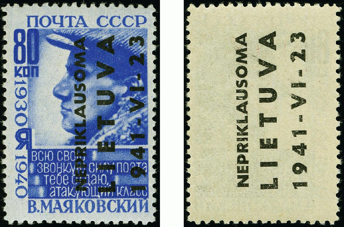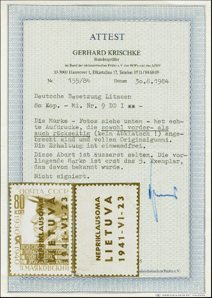 | Zusatzinformationen und Suchstichworte: | 383. Auktion Heinrich Köhler 14.–15. & 18.–23. März 2024 Los 3103 Deutsche Besetzung II. WK Litauen 1941, Majakowski 80 K. blau mit vorder- und rückseitigem Aufdruck, postfrisch, tadellos, eine sehr seltene Abart Ausruf 700,00 EUR |