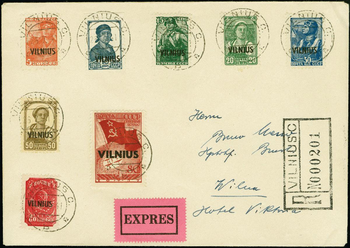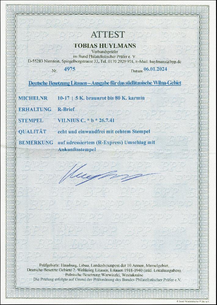 | Zusatzinformationen und Suchstichworte: | 383. Auktion Heinrich Köhler 14.–15. & 18.–23. März 2024 Los 3106 Deutsche Besetzung II. WK Litauen 5-80 K. mit Stempel "VILNIUS 26.7.41" auf adressiertem R-Express-Brief mit Ankunftstempel, tadellos Ausruf 120,00 EUR |