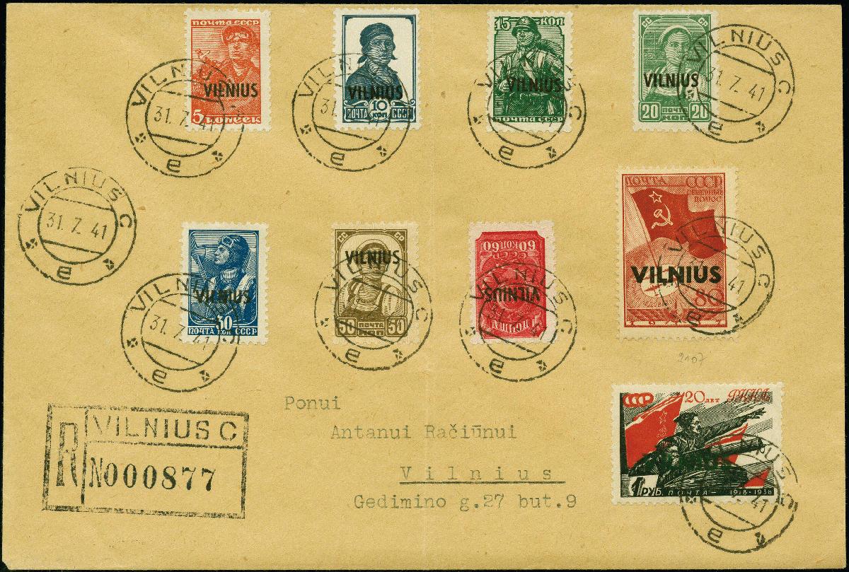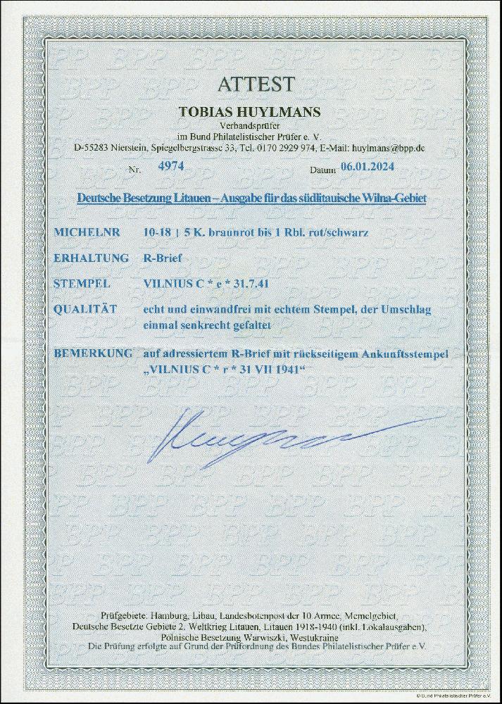 | Zusatzinformationen und Suchstichworte: | 383. Auktion Heinrich Köhler 14.–15. & 18.–23. März 2024 Los 3107 Deutsche Besetzung II. WK Litauen 5K. - 1 Rbl. mit Stempel "VILNIUS 31.7.41" auf adressiertem R-Express-Brief mit Ankunftstempel, einmal senkrecht gefaltet, tadellos Ausruf 400,00 EUR |