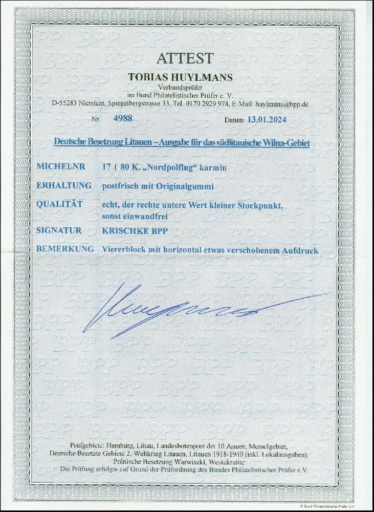 | Zusatzinformationen und Suchstichworte: | 383. Auktion Heinrich Köhler 14.–15. & 18.–23. März 2024 Los 3109 Deutsche Besetzung II. WK Litauen Nordpol 80K. mit horizontal verschobenem Aufdruck im Viererblock, postfrisch, ein Wert kleiner Stockpunkt, sonst tadellos Ausruf 600,00 EUR |