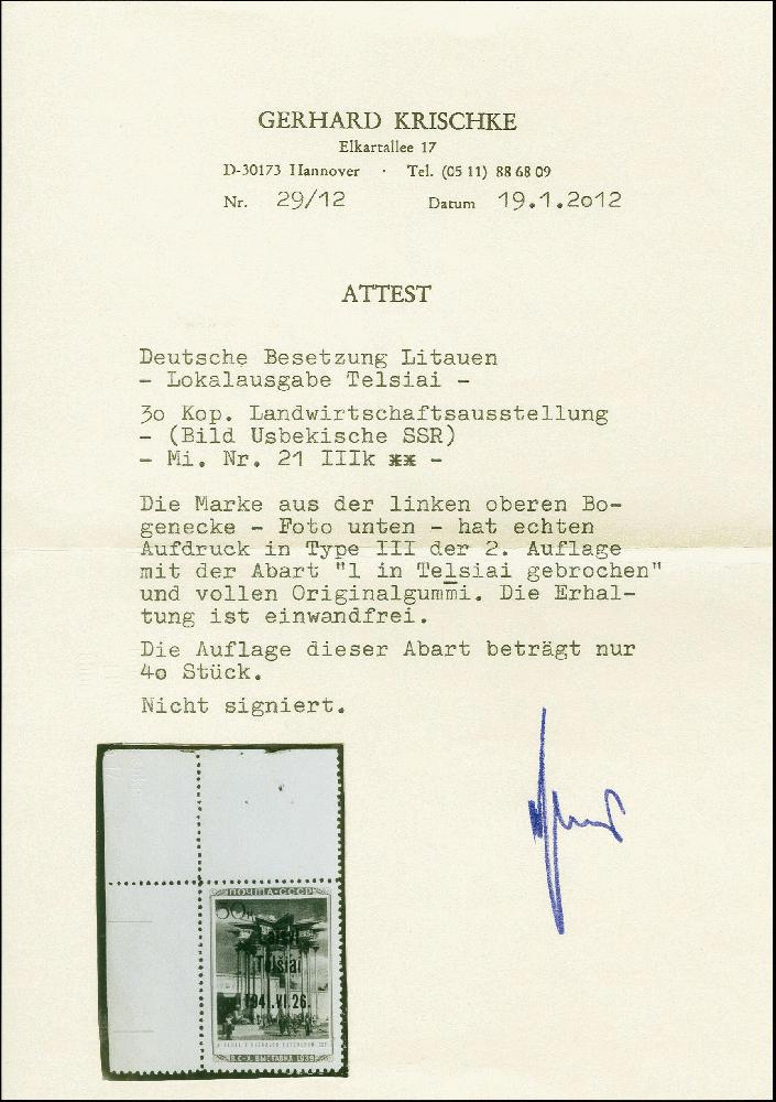 | Zusatzinformationen und Suchstichworte: | 383. Auktion Heinrich Köhler 14.–15. & 18.–23. März 2024 Los 3130 Deutsche Besetzung II. WK Litauen Telsiai Usbekische SSR 30K. aus der linken oberen Bogenecke, Aufdrucktype IIIb mit Aufdruckfehler "i statt l in Telsiai",postfrisch, tadellos Ausruf 150,00 EUR |