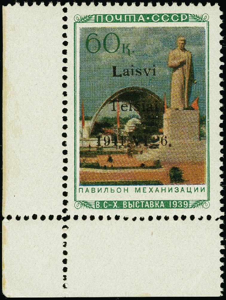 | Zusatzinformationen und Suchstichworte: | 383. Auktion Heinrich Köhler 14.–15. & 18.–23. März 2024 Los 3131 Deutsche Besetzung II. WK Litauen Telsiai Pavillon 60 K. aus der linken unteren Bogenecke, Aufdrucktyp I, postfrisch, tadellos Ausruf 120,00 EUR |