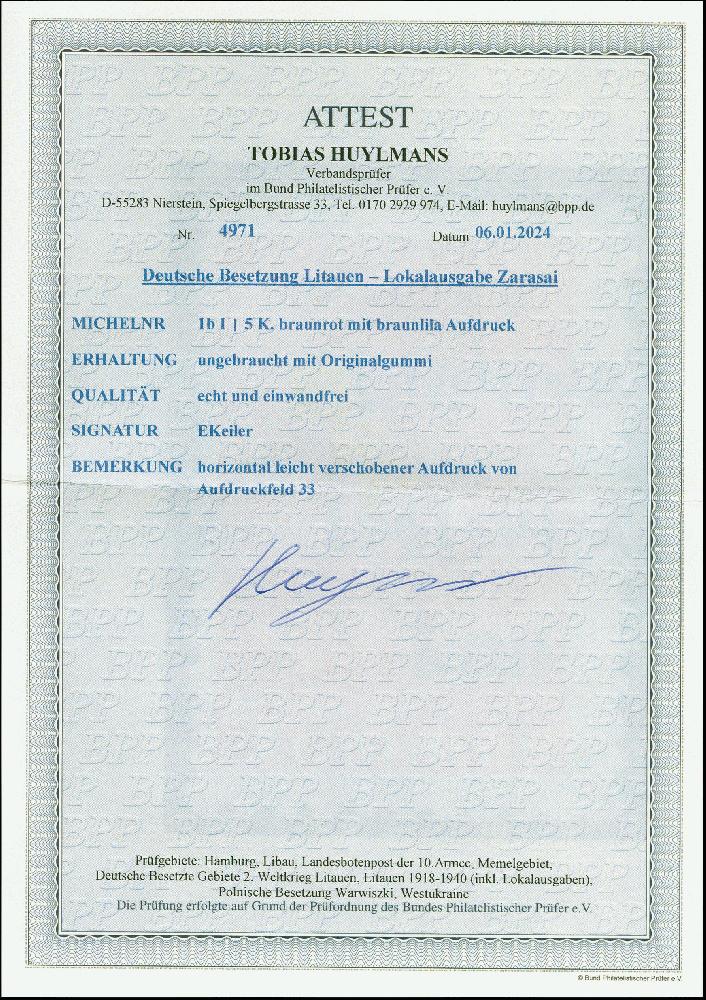 | Zusatzinformationen und Suchstichworte: | 383. Auktion Heinrich Köhler 14.–15. & 18.–23. März 2024 Los 3133 Deutsche Besetzung II. WK Litauen Zarasai 5 K. mit braunrotem Aufdruck in Type I, sauber ungebraucht, tadellos Ausruf 250,00 EUR |