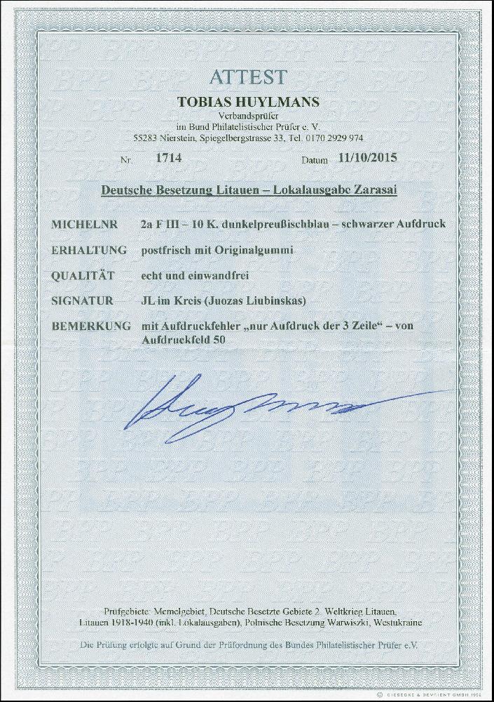 | Prüfgebiet: | Deutsche Besetzung WK 2 Litauen Zarasai |