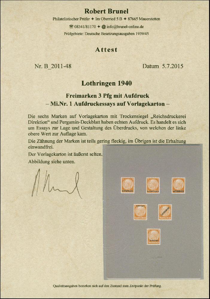 | Zusatzinformationen und Suchstichworte: | 383. Auktion Heinrich Köhler 14.–15. & 18.–23. März 2024 Los 3132 Deutsche Besetzung II. WK Lothringen 1940, Aufdruckessays auf Hindenburg 3 Pfg. auf Vorlagekarton mit Trockensiegel "Reichsdruckerei Direktion" und Pergaminschutzblatt, 6 Werte mit verschiedenen Aufdrucken, dabei der später verausgabte Aufdruck, teils unbedeutend fleckig, sonst tadellos, sehr dekorativ und selten Ausruf 800,00 EUR |