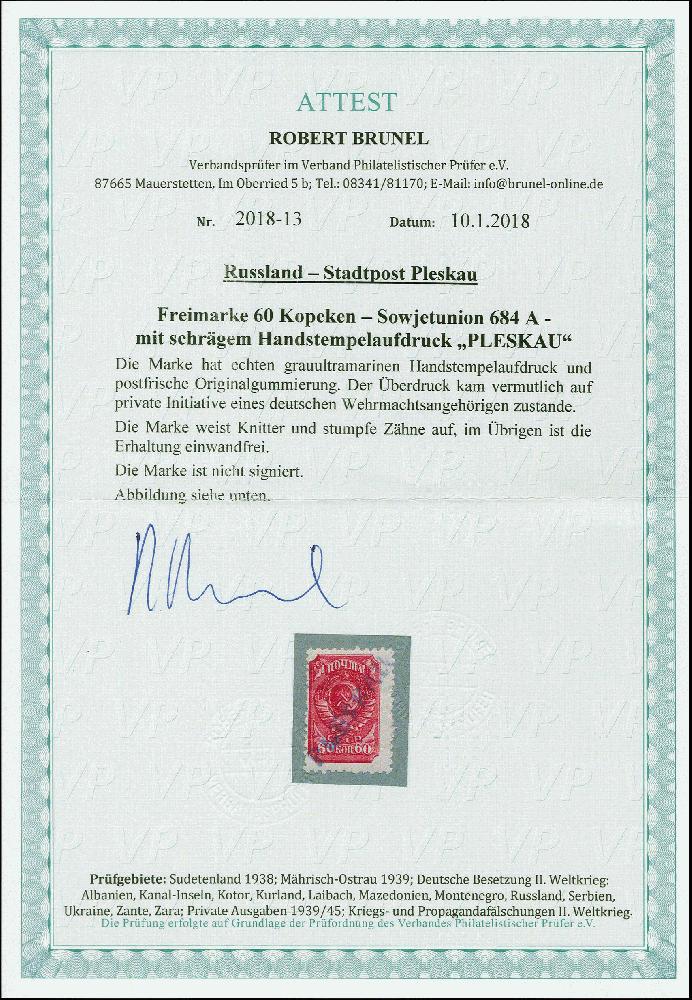 | Zusatzinformationen und Suchstichworte: | 383. Auktion Heinrich Köhler 14.–15. & 18.–23. März 2024 Los 3153 Deutsche Besetzung II. WK Russland - Pleskau 60 K. mit grauultramarinem Handstempelaufdruck "PLESKAU", postfrisch, waagerechte Knitter und einige stumpfe Zähne, sonst tadellos, selten Ausruf 400,00 EUR |