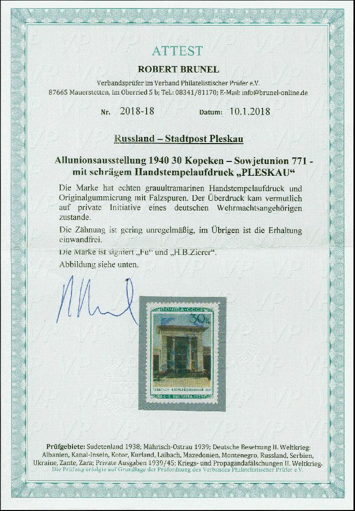 | Zusatzinformationen und Suchstichworte: | 383. Auktion Heinrich Köhler 14.–15. & 18.–23. März 2024 Los 3156 Deutsche Besetzung II. WK Russland - Pleskau Aserbaidschanische SSR 30 K. mit grauultramarinem Handstempelaufdruck "PLESKAU", sauber ungebraucht, gering unregelmäßig gezähnt, winzig fleckig Ausruf 500,00 EUR |