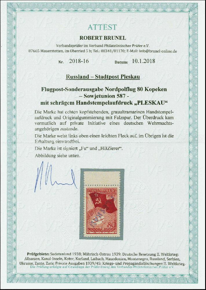 | Zusatzinformationen und Suchstichworte: | 383. Auktion Heinrich Köhler 14.–15. & 18.–23. März 2024 Los 3158 Deutsche Besetzung II. WK Russland - Pleskau Nordpol 80 K., Oberrandstück mit kopfstehenden, grauultramarinem Handstempelaufdruck "PLESKAU", sauber ungebraucht, winzig fleckig, sonst tadellos, selten Ausruf 500,00 EUR |