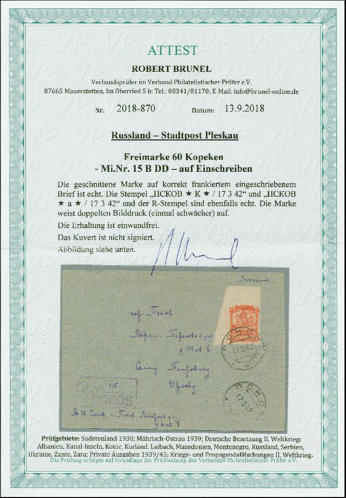| Zusatzinformationen und Suchstichworte: | 383. Auktion Heinrich Köhler 14.–15. & 18.–23. März 2024 Los 3165 Deutsche Besetzung II. WK Russland - Pleskau 60K. Kathedrale geschnitten mit klarem Doppeldruck, sauber mit Stempel "PSKOV 17 3 42" auf R-Brief, zwei senkrechte Faltungen, tadellos Ausruf 200,00 EUR |