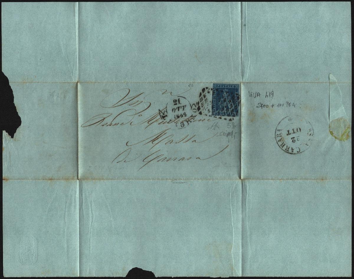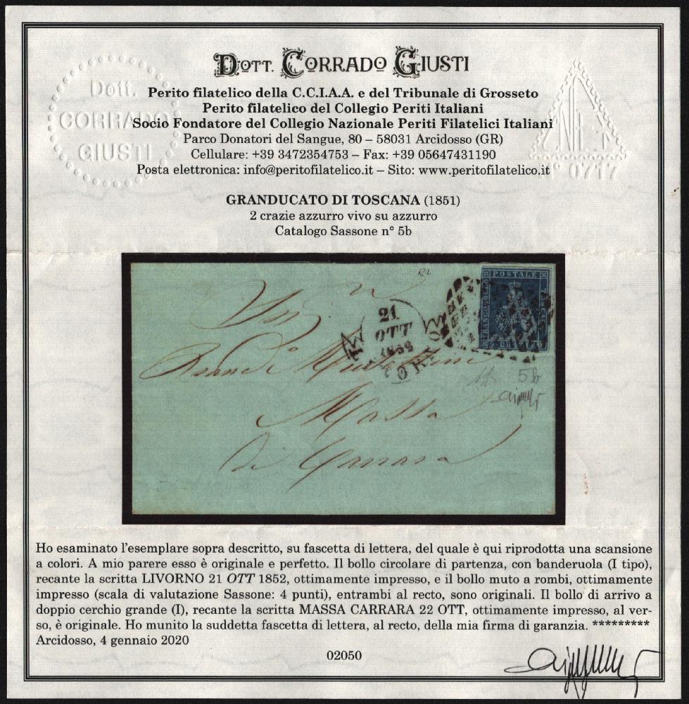 | Zusatzinformationen und Suchstichworte: | Versuch einer Übersetzung: GROSSHERZOGTUM TOSKANA (1851) 2 Crazie Lebhaftblau auf Blau Sassone-Katalog Nr. 5b Ich habe das oben beschriebene Exemplar auf einem Briefumschlag untersucht, von dem hier ein Farbscan wiedergegeben ist. Meiner Meinung nach ist es original und perfekt. Der kreisrunde Abgangsstempel mit Fahne (Typ I) mit den Worten LIVORNO 21 OTT 1852, ausgezeichnet gestempelt, und der stumme Diamantstempel, ausgezeichnet gestempelt (Sassone-Bewertungsskala: 4 Punkte), beide auf der Vorderseite, sind original. Der Ankunftsstempel mit großem Doppelkreis (I) mit rückseitig hervorragend geprägter Aufschrift MASSA CARRARA 22 OTT ist original. Ich habe den vorgenannten Umschlag auf der Vorderseite mit meiner Garantieunterschrift versehen. Arcidosso, 4. Januar 2020 |