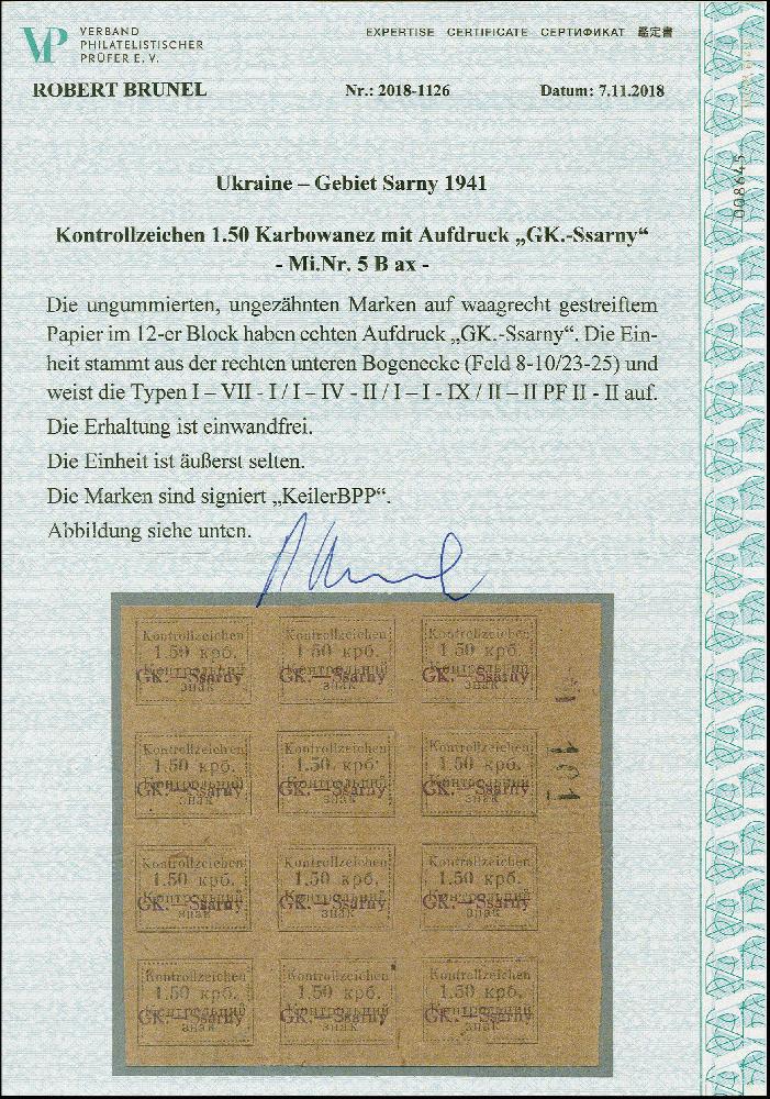 | Zusatzinformationen und Suchstichworte: | 383. Auktion Heinrich Köhler 14.–15. & 18.–23. März 2024 Los 3194 Deutsche Besetzung II. WK Ukraine Sarny 1941, 1,50 Krb. geschnitten, 12er-Block aus der rechten unteren Bogenecke, Aufdrucktype I-VII-I / 1-IV-II / I-I-IX / II-II PF II-II, ungebraucht ohne Gummi, tadellos Ausruf 400,00 EUR |