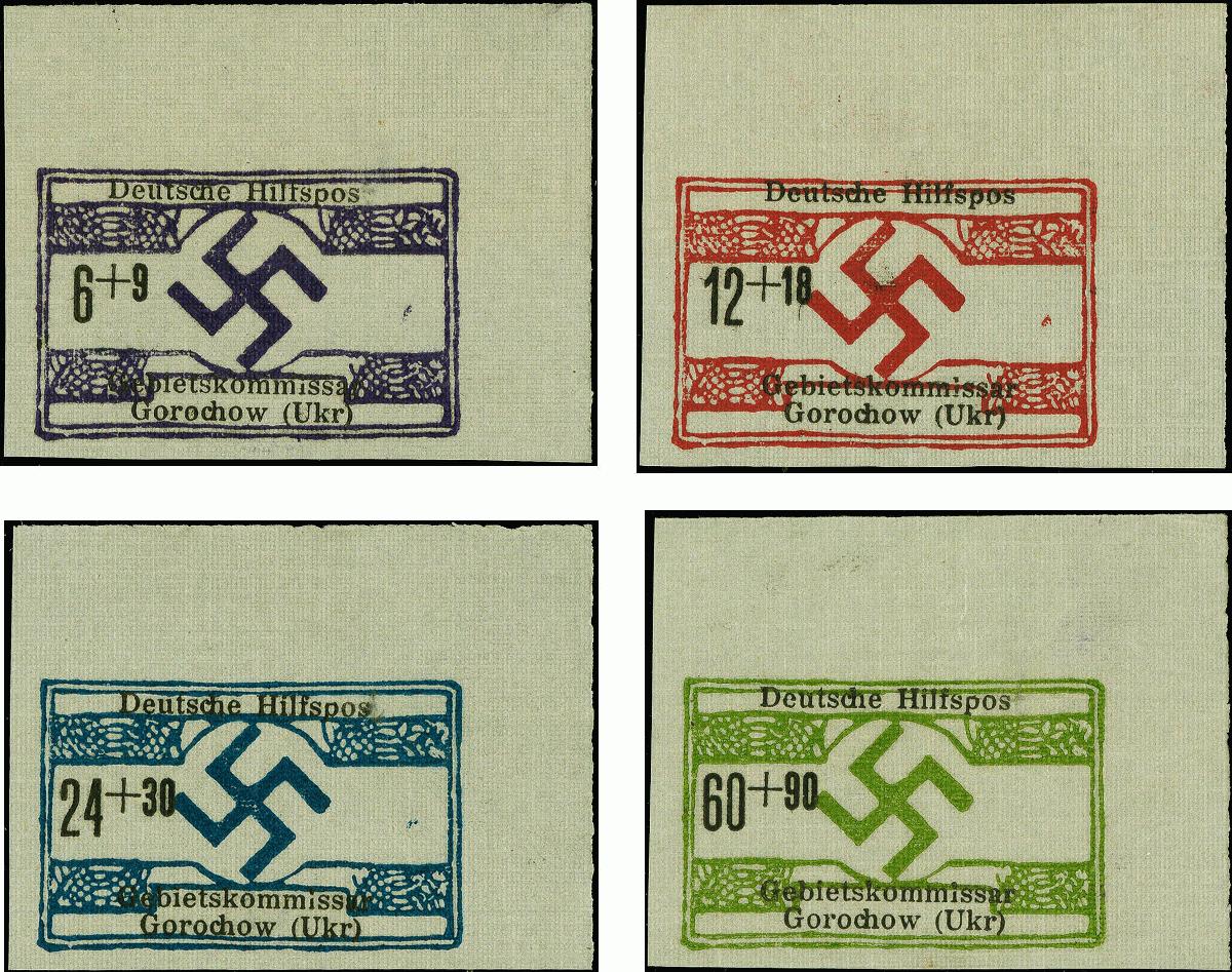 | Zusatzinformationen und Suchstichworte: | 383. Auktion Heinrich Köhler 14.–15. & 18.–23. März 2024 Los 3196 Deutsche Besetzung II. WK Ukraine Südukraine Gorochow 6-60 Pfg. auf Leinenpapier, einheitlich aus der rechten oberen Bogenecke, mit Abart "fehlendes t in Hilfspost", dieses handschriftlich ergänzt, ohne Gummi wie verausgabt, tadellos und in dieser Form Unikat. Es handelt sich um die nicht zur Ausgabe gelangte Ausführung zur späteren 2. Ausgabe. Dazu wurden die Druckstöcke der 1. Ausgabe teilweise verändert, vorallem in der Beschriftung. Aus verschiedenen Gründen, u.a. wegen der unrichtigen Zuschlagsangabe 30 statt 36 bei dem Wert zu 24 Pfg. wurde diese Ausführung abgelehnt Ausruf 4.000,00 EUR |