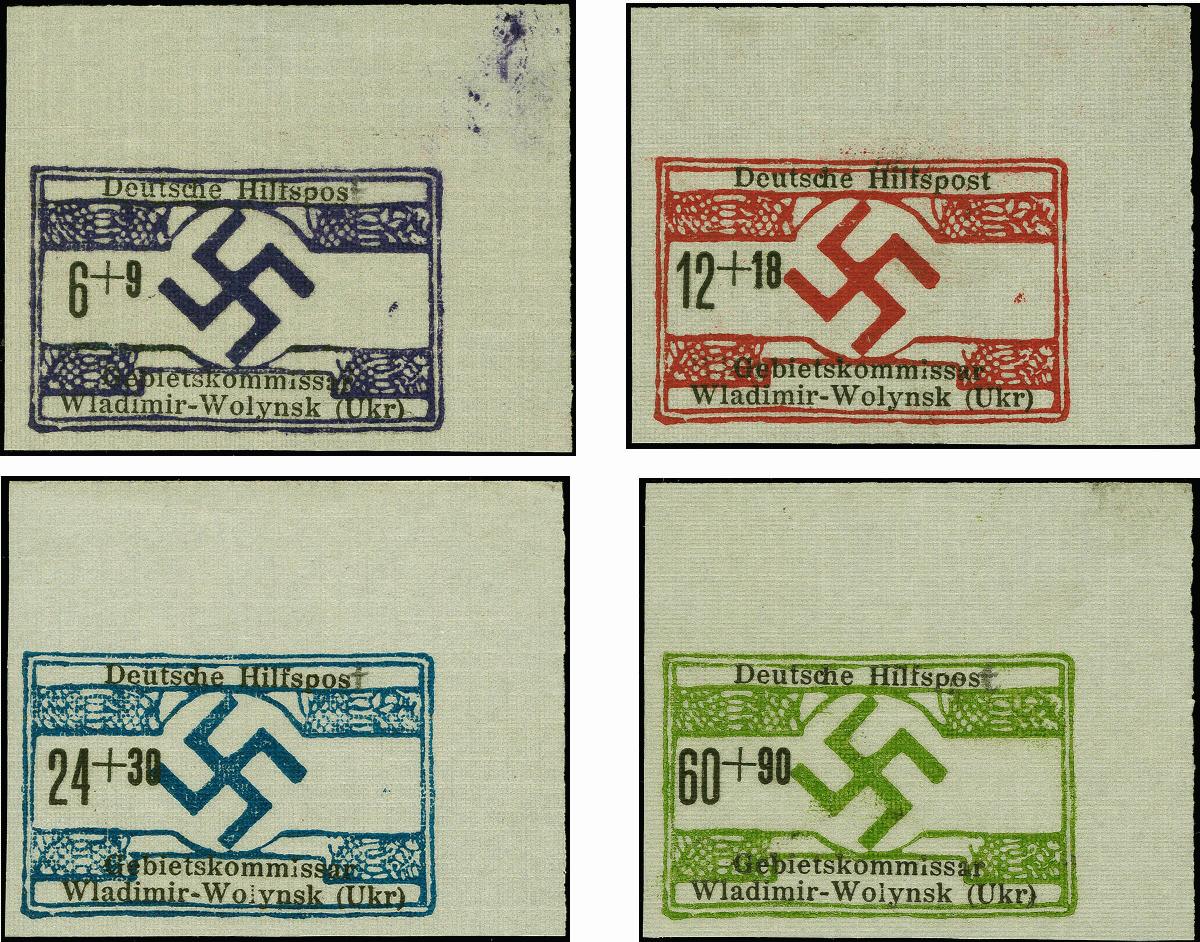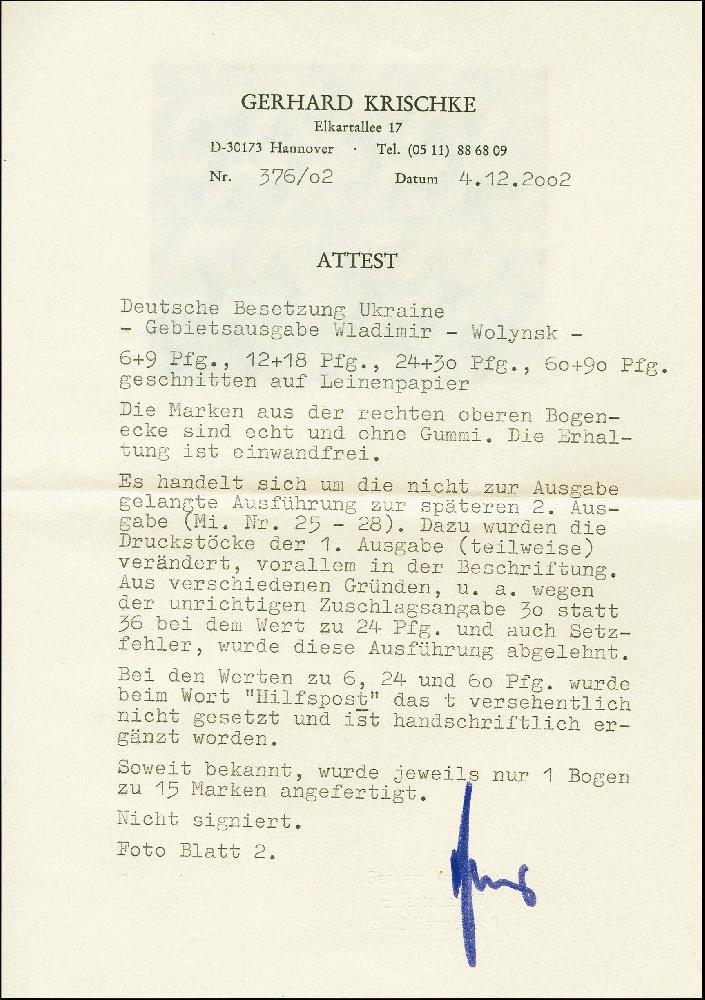 | Zusatzinformationen und Suchstichworte: | 383. Auktion Heinrich Köhler 14.–15. & 18.–23. März 2024 Los 3198 Deutsche Besetzung II. WK Ukraine Südukraine Wladimir-Wolynsk 6-60 Pfg. auf Leinenpapier, einheitlich aus der rechten oberen Bogenecke, 6, 24 und 60 Pfg. mit Abart "fehlendes t in Hilfspost", dieses handschriftlich ergänzt, ohne Gummi wie verausgabt, tadellos und in dieser Form Unikat. Es handelt sich um die nicht zur Ausgabe gelangte Ausführung zur späteren 2. Ausgabe. Dazu wurden die Druckstöcke der 1. Ausgabe teilweise verändert, vor allem in der Beschriftung. Aus verschiedenen Gründen, u.a. wegen der unrichtigen Zuschlagsangabe 30 statt 36 bei dem Wert zu 24 Pfg. wurde diese Ausführung abgelehnt Ausruf 4.000,00 EUR |
