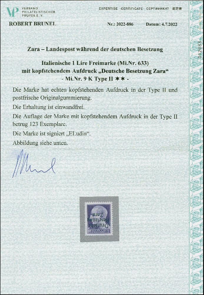 | Zusatzinformationen und Suchstichworte: | 383. Auktion Heinrich Köhler 14.–15. & 18.–23. März 2024 Los 3209 Deutsche Besetzung II. WK Zara 1 L. mit kopfstehendem Aufdruck in Type II, Auflage nur 123 Stück, postfrisch, tadellos Ausruf 200,00 EUR |