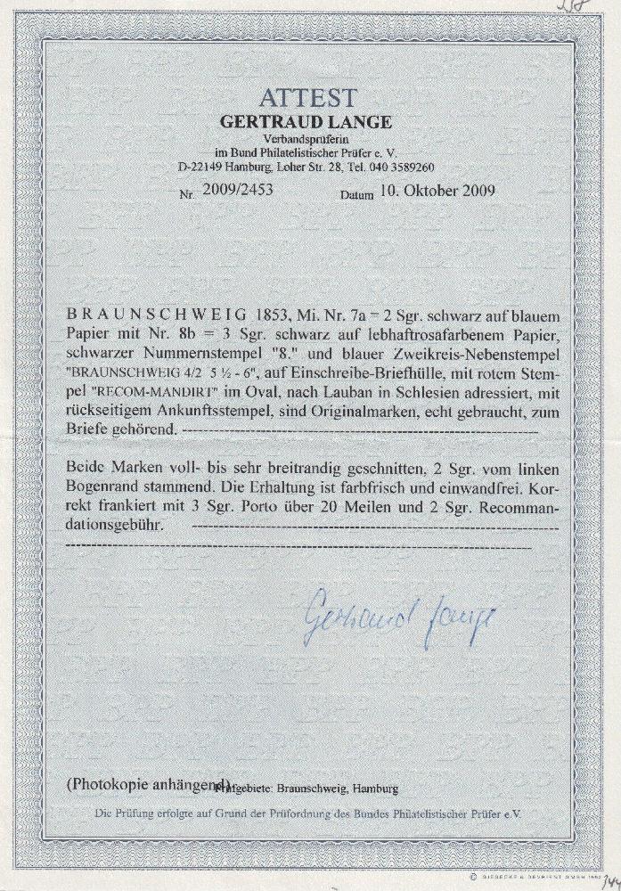 | Zusatzinformationen und Suchstichworte: | Südphila P. Feuser 101. Auktion 16. März 2024 Los 156 Altdeutschland Braunschweig 2 Sgr. a. blau und 3 Sgr. a. lebhaftrosa, voll- bis breitrandige Kabinettstücke mit Stempel "8" Braunschweig auf schönem Chargébrief (roter Ovalstempel RECOMMANDIRT) nach Lauban/Schlesien Ausruf 400,00 EUR |