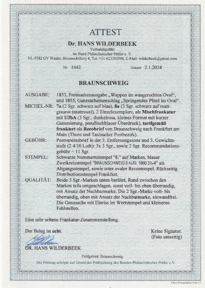 | Zusatzinformationen und Suchstichworte: | Südphila P. Feuser 101. Auktion 16. März 2024 Los 162 Altdeutschland Braunschweig 2 Sgr. a. blau, breitrandig nebst zwei unten berührten Exemplaren 3 Sgr. a. rosa auf Chargé-Couvert 3 Sgr. karmin (kl. Randfehler) mit Stempel "8" Braunschweig nach Frankfurt a.M., eine sehr seltene Kombination auf dreifach schwerem Chargébrief Ausruf 500,00 EUR |