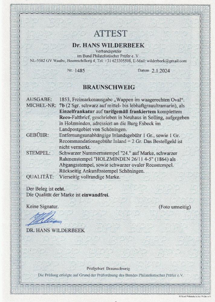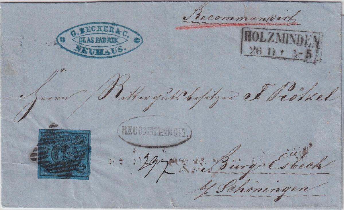 | Zusatzinformationen und Suchstichworte: | Südphila P. Feuser 101. Auktion 16. März 2024 Los 164 Altdeutschland Braunschweig 2 Sgr. a. blau, breitrandig mit Stempel "21" Holzminden auf Luxus-Chargébrief der Glasfabrik G. Becker & C., Neuhaus (schöner Firmenstempel) nach Burg Esbeck bei Schöningen, das Landpost-Bestellgeld zahlte der Empfänger, dek. Neben-Ovalstempel RECOMMANDIRT Ausruf 250,00 EUR |