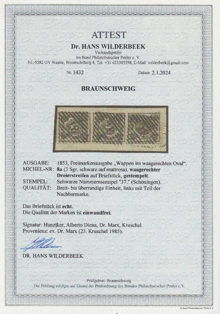 | Zusatzinformationen und Suchstichworte: | Südphila P. Feuser 101. Auktion 16. März 2024 Los 167 Altdeutschland Braunschweig 3 Sgr. a. rosa, breitrandiger waagerechter Dreierstreifen auf vorzüglichem Luxus-Briefstück mit klaren Stempeln "37" Schöningen, eine sehr seltene Einheit Ausruf 500,00 EUR |