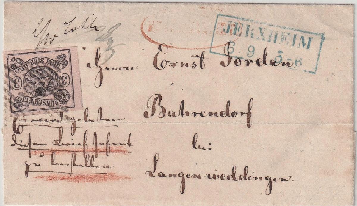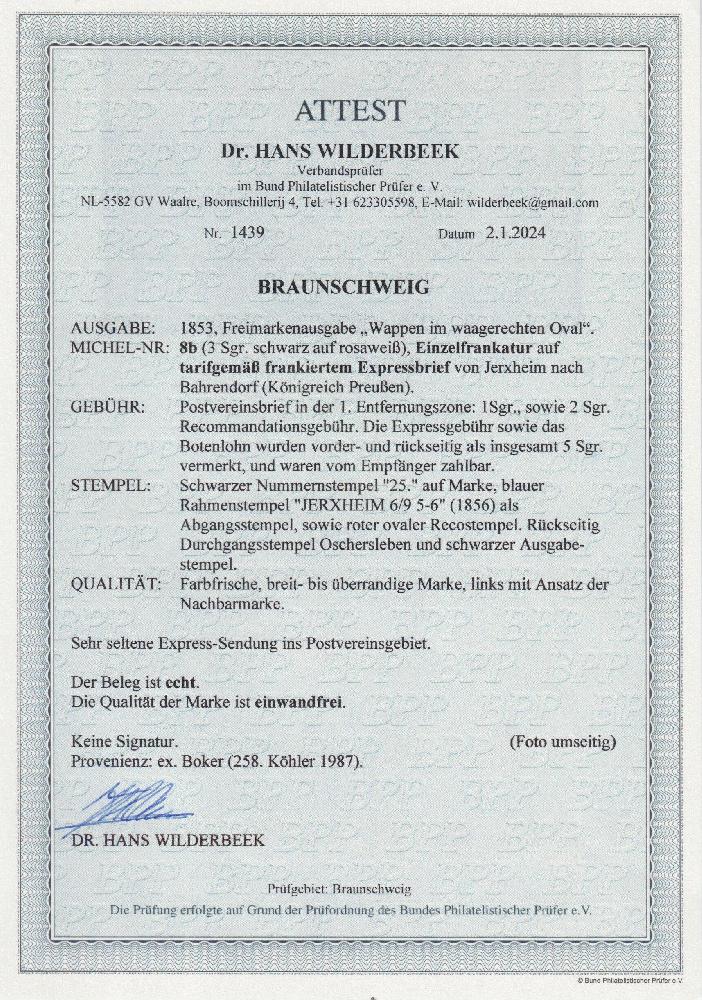 | Zusatzinformationen und Suchstichworte: | Südphila P. Feuser 101. Auktion 16. März 2024 Los 169 Altdeutschland Braunschweig 3 Sgr. a. rosa, breitrandig mit Stempel "25" Jerxheim auf kleinem Luxus-Expressbrief nach Bahrendorf bei Langenweddingen (rs. sind 5 Sgr. Botenlohn für die Landpostbestellung vermerkt), hs. "Es wird gebeten, diesen Brief sofort zu bestellen", ein außergewöhnlich schönes und seltenes Poststück Ausruf 1.000,00 EUR |