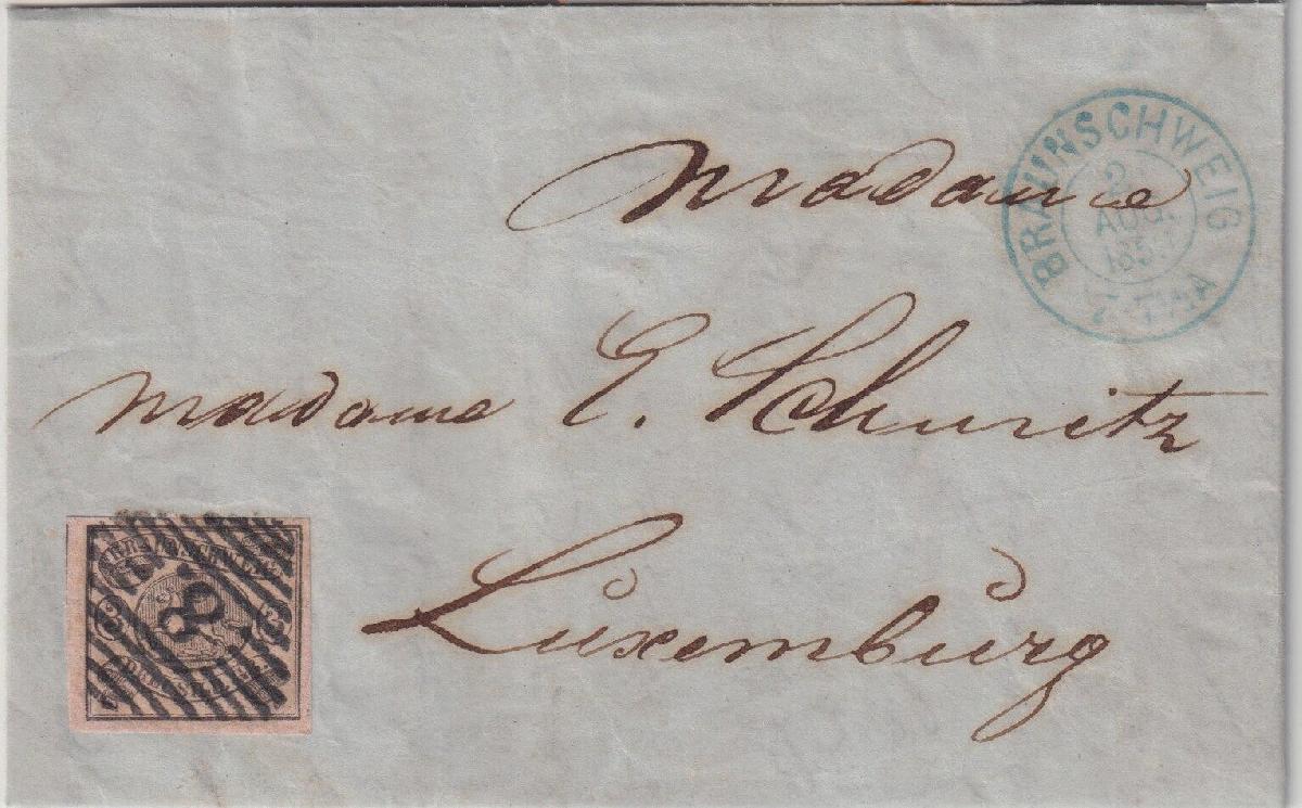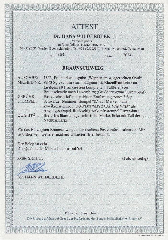 | Zusatzinformationen und Suchstichworte: | Südphila P. Feuser 101. Auktion 16. März 2024 Los 171 Altdeutschland Braunschweig 3 Sgr. a. rosa, breitrandig (links Nebenmarke) mit klarem Stempel "8" Braunschweig auf Luxusbrief nach Luxemburg, eine der sehr seltenen Destinationen im Deutsch-Österreichischem Postverein, lt. Attest Dr. Wilderbeek ist nur dieser eine frankierte Brief nach Luxemburg bekannt Ausruf 1.000,00 EUR |