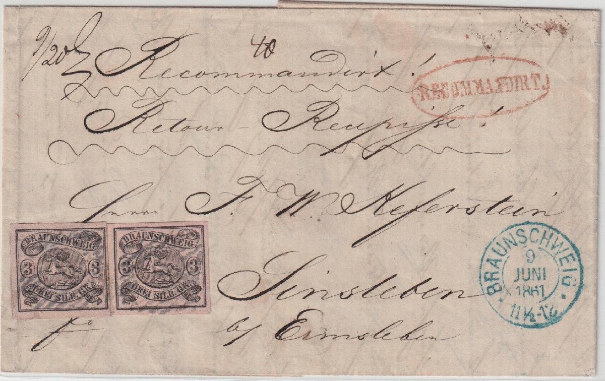 | Zusatzinformationen und Suchstichworte: | Südphila P. Feuser 101. Auktion 16. März 2024 Los 178 Altdeutschland Braunschweig 3 Sgr. lebhaftrosa, zwei breitrandige Exemplare mit Stempel "9" Braunschweig auf Luxus-Chargébrief "Recommandirt. Retour-Recepisse" nach Sinsleben bei Ermsleben, roter Neben-Ovalstempel RECOMMANDIRT (Porto 2 Sgr., Recommandation 2 Sgr., Recepisse 2 Sgr.), ein möglicherweise einmaliges Poststück Ausruf 2.000,00 EUR |