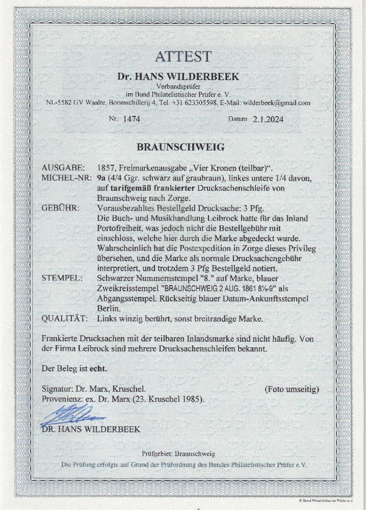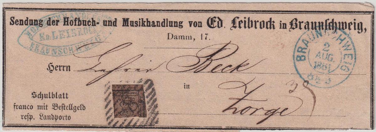 | Zusatzinformationen und Suchstichworte: | Südphila P. Feuser 101. Auktion 16. März 2024 Los 187 Altdeutschland Braunschweig 1/4 Ggr. a. braun, einzeln als Bestellgeld auf ansonsten portofreiem Vordruck-Streifband (Schulblatt der Hofbuchhandlung Ed. Leibrock) mit Stempel "8" Braunschweig nach Zorge (Bestellgeld wurde trotzdem erhoben), ein außergewöhnliches Poststück Ausruf 400,00 EUR |