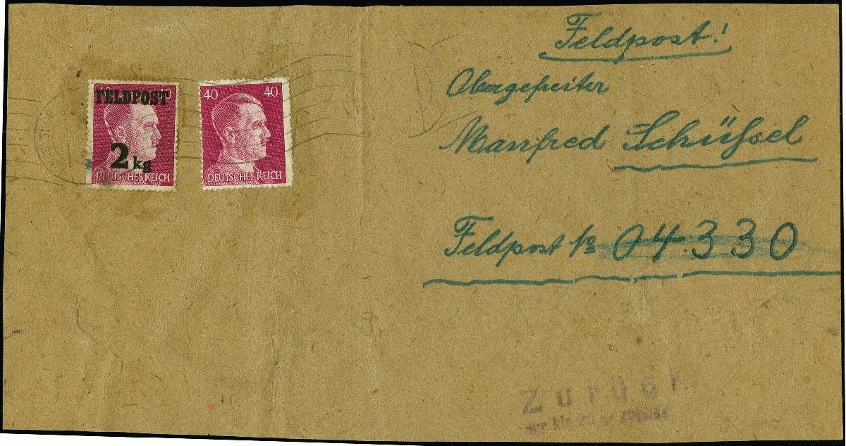 | Zusatzinformationen und Suchstichworte: | 383. Auktion Heinrich Köhler 14.–15. & 18.–23. März 2024 Los 3249 Deutsche Besetzung II. WK, Feldpostmarken 1944, Päckchen-Zulassungsmarke 2 kg auf 40 Pfg. und Hitler 40 Pfg. mit Handrollstempel "DINKESBÜHL ?0.02.1945" auf Verpackungsausschnitt, ohne Abenderadresse an einen Soldaten mit der Feldpost-Nummer "04330" (187 Panzerjäger-Abteilung), Einsatz bei der 87. Infanterie-Division in Kurland, sehr wahrscheinlich nach Ablauf der Gültigkeit der Zulassungsmarke am 10.02.1945 aufgegeben und mit dem Leitstempel "Zurück / nur bis 20g zugelassen" retouniert; Marken mit Fremdgummierung aufgeklebt sowie geschürft, aufgrund des Umgangs mit Päckchen zu tolerieren, selten Ausruf 1.000,00 EUR |