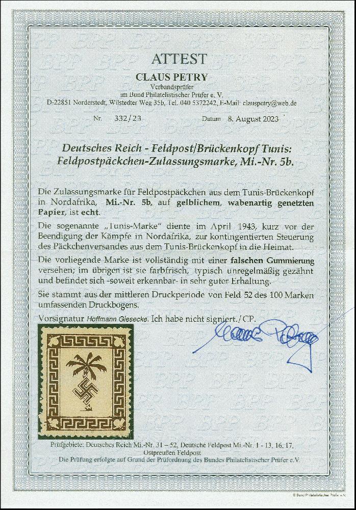 | Zusatzinformationen und Suchstichworte: | 383. Auktion Heinrich Köhler 14.–15. & 18.–23. März 2024 Los 3255 Deutsche Besetzung II. WK, Feldpostmarken 1943, Tunis-Päckchenmarke auf mittelchromgelbem, genetztes Papier, ungebraucht mit Neugummi, sonst in tadelloser Erhaltung Ausruf 100,00 EUR |