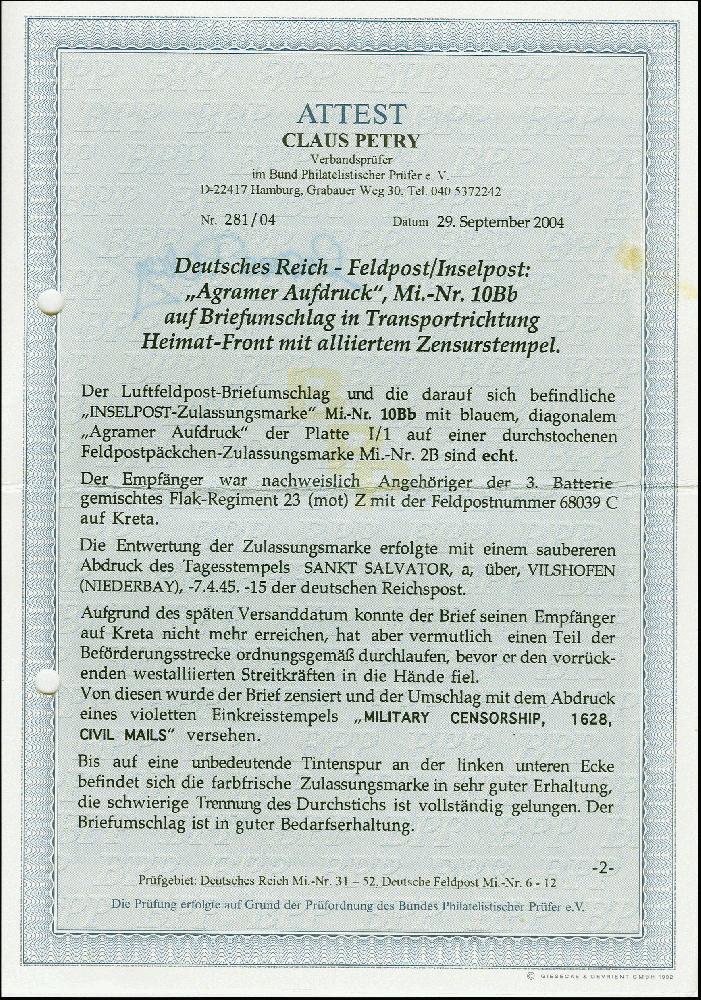 | Prüfgebiet: | Deutsches Reich Feldpost WK 2 |