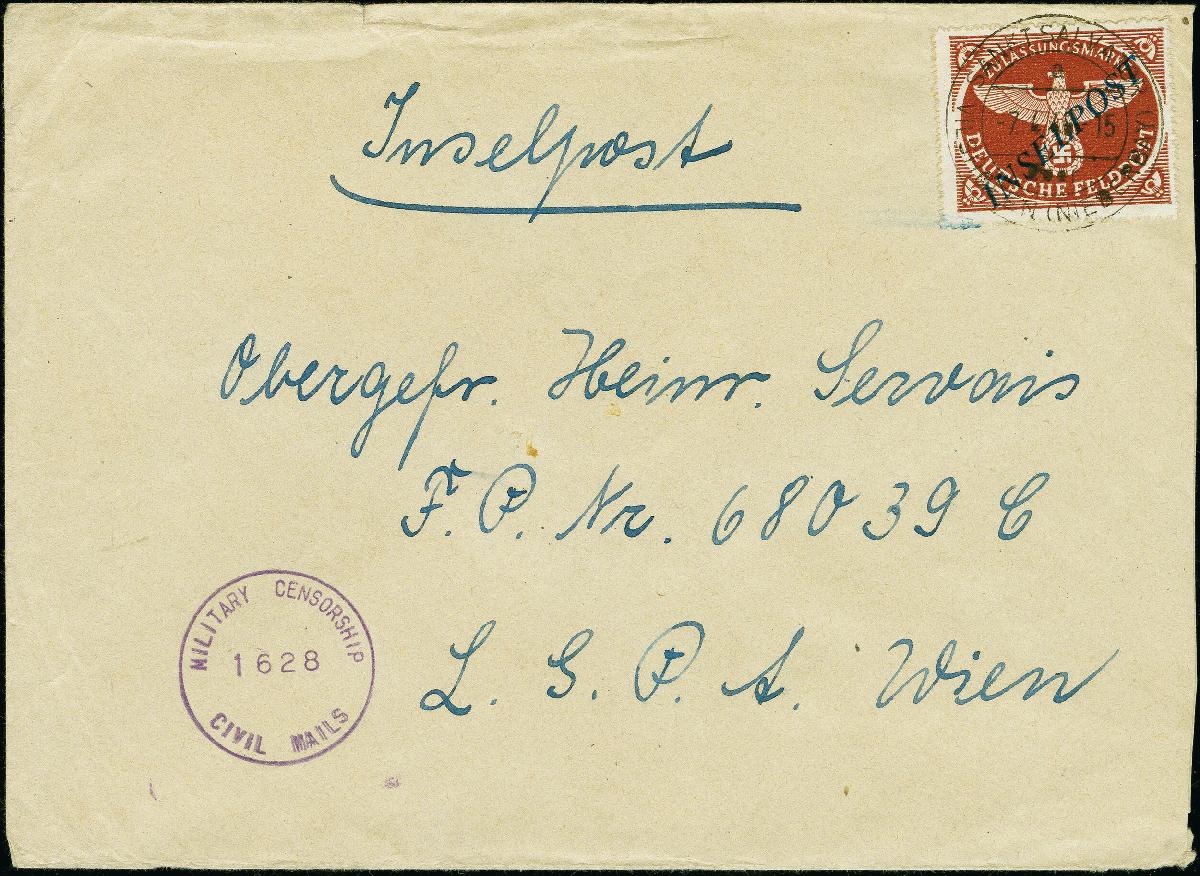 | Zusatzinformationen und Suchstichworte: | 383. Auktion Heinrich Köhler 14.–15. & 18.–23. März 2024 Los 3257 Deutsche Besetzung II. WK, Feldpostmarken 1944, Agramer Aufdruck durchstochen, klar entwertet durch Stempel "SANKT SALVATOR VILSHOFEN (NIEDERBAY) -7.4.45" auf Brief nach Kreta (Feldpostnummer 68039 C, in Transportrichtung Heimat-Front), Empfänger nicht mehr erreichbar und mit Zensurtempeln der westalliierten Streitkräfte, seltener Brief in guter Erhaltung Ausruf 100,00 EUR |