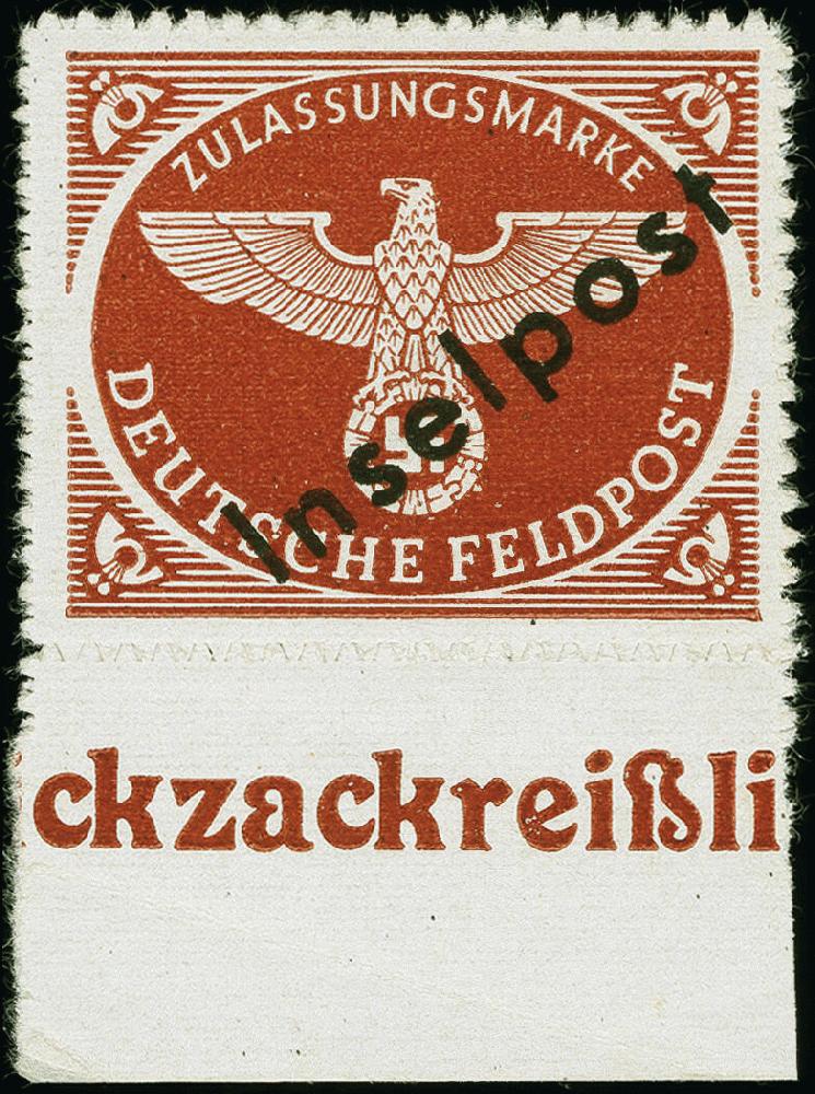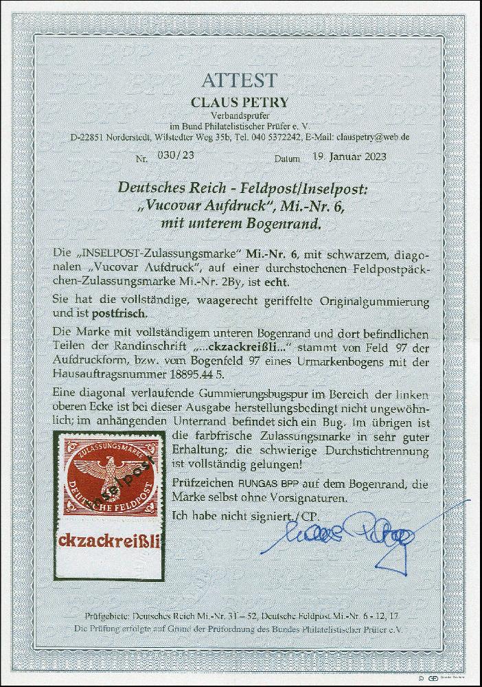 | Zusatzinformationen und Suchstichworte: | 383. Auktion Heinrich Köhler 14.–15. & 18.–23. März 2024 Los 7722 Deutsche Besetzung II. WK, Feldpostmarken 1944, Vukovar-Aufdruck mit Unterrand und Inschrift "ckzackreißli", postfrisch mit leichtem Gummibug, in einwandfreier Erhaltung (im Unterrand mit Bugspur) Ausruf 400,00 EUR |
