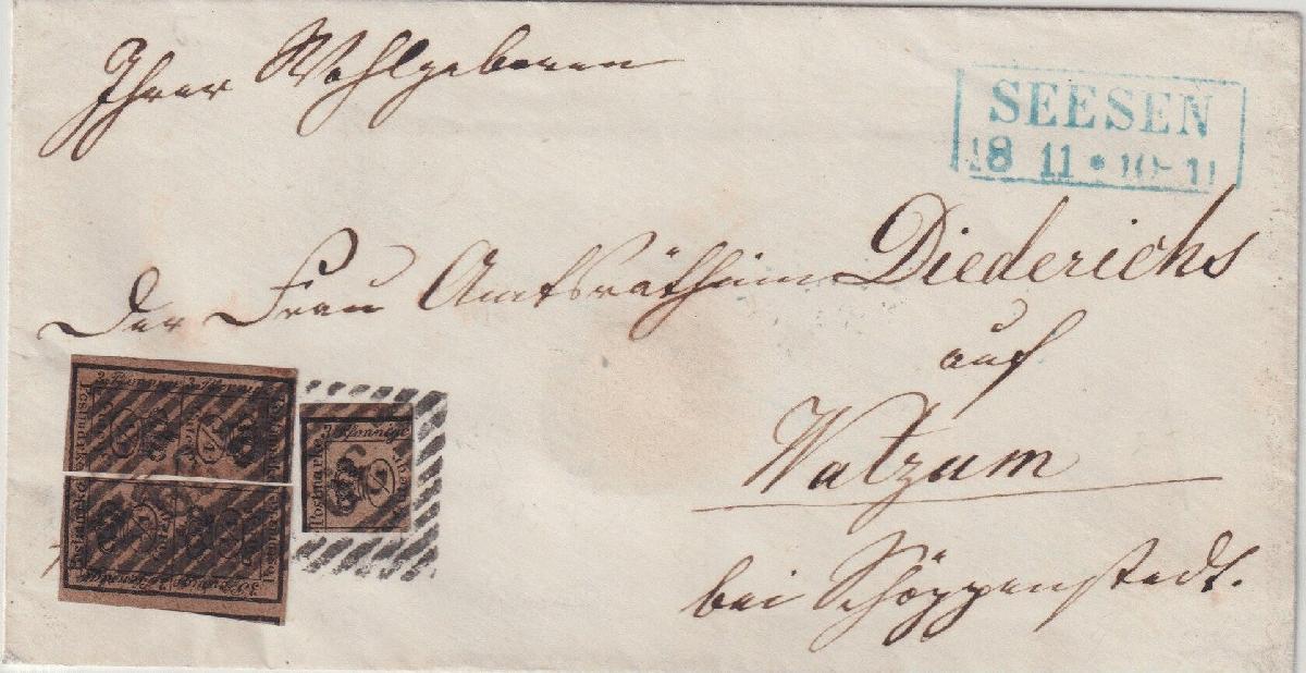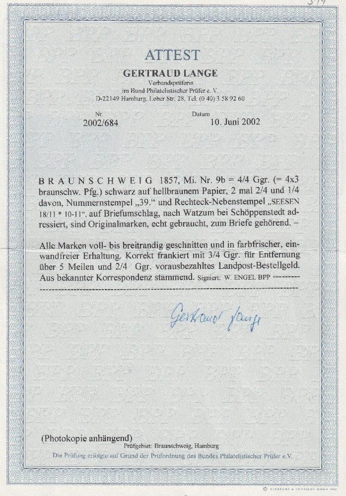 | Zusatzinformationen und Suchstichworte: | Südphila P. Feuser 101. Auktion 16. März 2024 Los 208 Altdeutschland Braunschweig 1/4 und zweimal 2/4 Ggr. a. gelbbraun mit Stempel "39" Seesen auf Kabinettbrief nach Watzum bei Schöppenstedt, 2/4 Ggr. Landpostporto wurden mitfrankiert Ausruf 200,00 EUR |