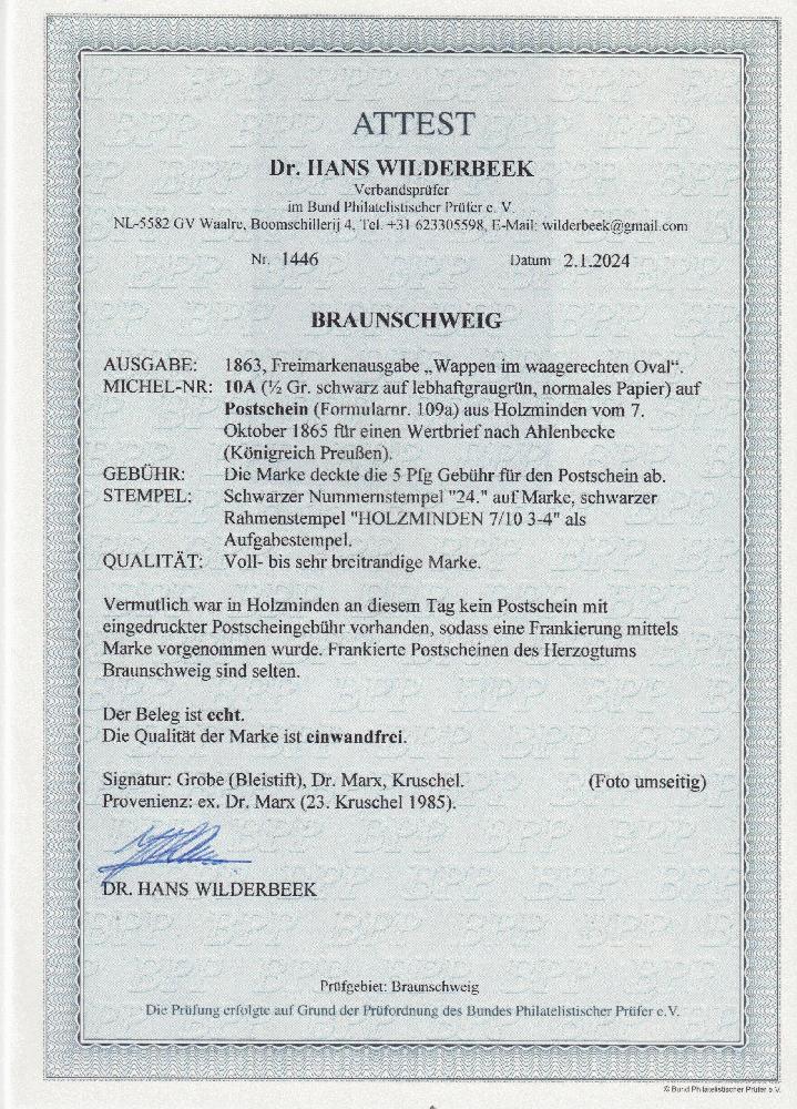 | Zusatzinformationen und Suchstichworte: | Südphila P. Feuser 101. Auktion 16. März 2024 Los 217 Altdeutschland Braunschweig 1/2 Gr. a. grün, breitrandiges Luxusstück als Scheingebühr mit Stempel "24" Holzminden auf Einlieferungsschein für einen Wertbrief nach Aplerbeck/Westfalen, ein schönes und seltenes Poststück Ausruf 800,00 EUR |