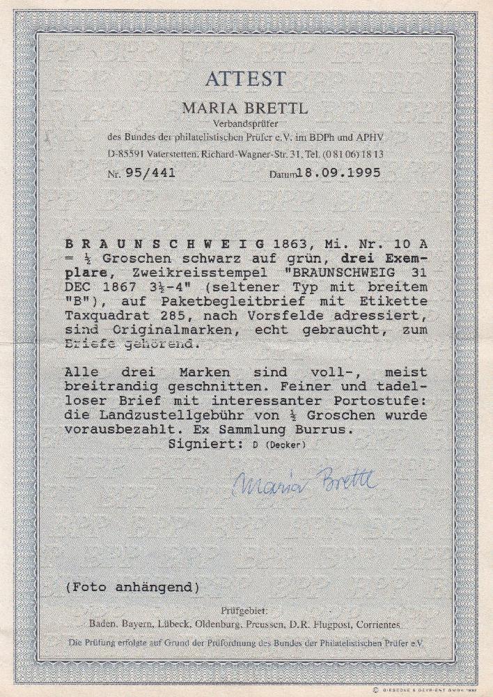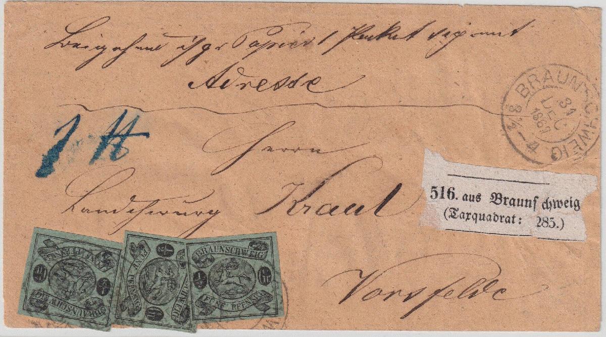 | Zusatzinformationen und Suchstichworte: | Südphila P. Feuser 101. Auktion 16. März 2024 Los 222 Altdeutschland Braunschweig 1/2 Gr. a. grün, drei breitrandige Prachtstücke mit Fahrpost-K2 BRAUNSCHWEIG 31.DEC.1867 auf gelbbraunem Paketbegleitbrief nach Vorsfelde (Taxquadrataufkleber), ein äußerst seltener Letzttagsbrief der Braunschweiger Post Ausruf 1.500,00 EUR |