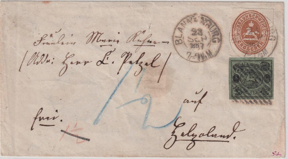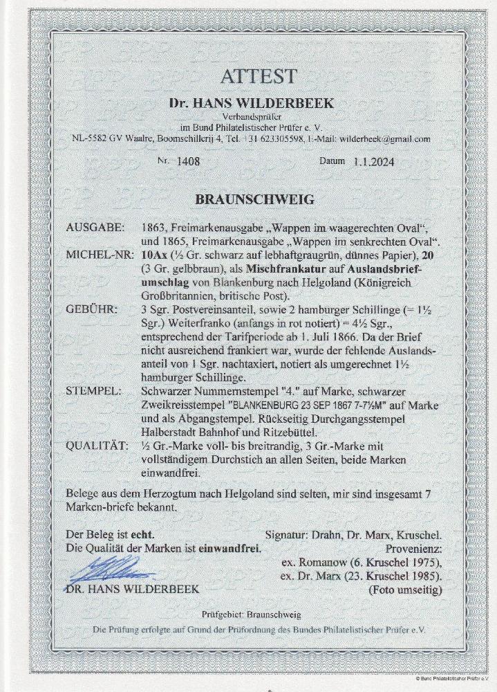 | Zusatzinformationen und Suchstichworte: | Südphila P. Feuser 101. Auktion 16. März 2024 Los 230 Altdeutschland Braunschweig 1/2 Gr. a. grün, breitrandig und 3 Gr. braun, Kabinettstücke mit Stempel "4" Blankenburg nach Helgoland, der Brief ist unzureichend frankiert (Nachtaxe "1 1/2" Sgr.), es sind nur wenige Briefe nach Helgoland bekannt Ausruf 3.000,00 EUR |