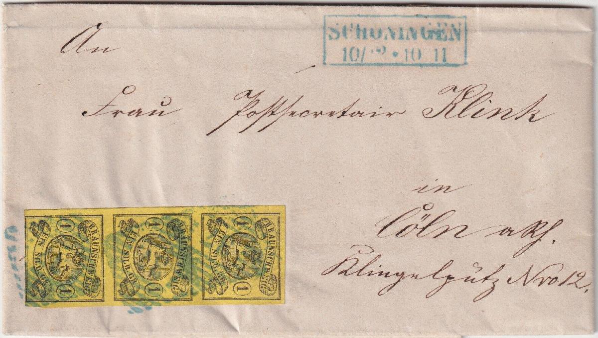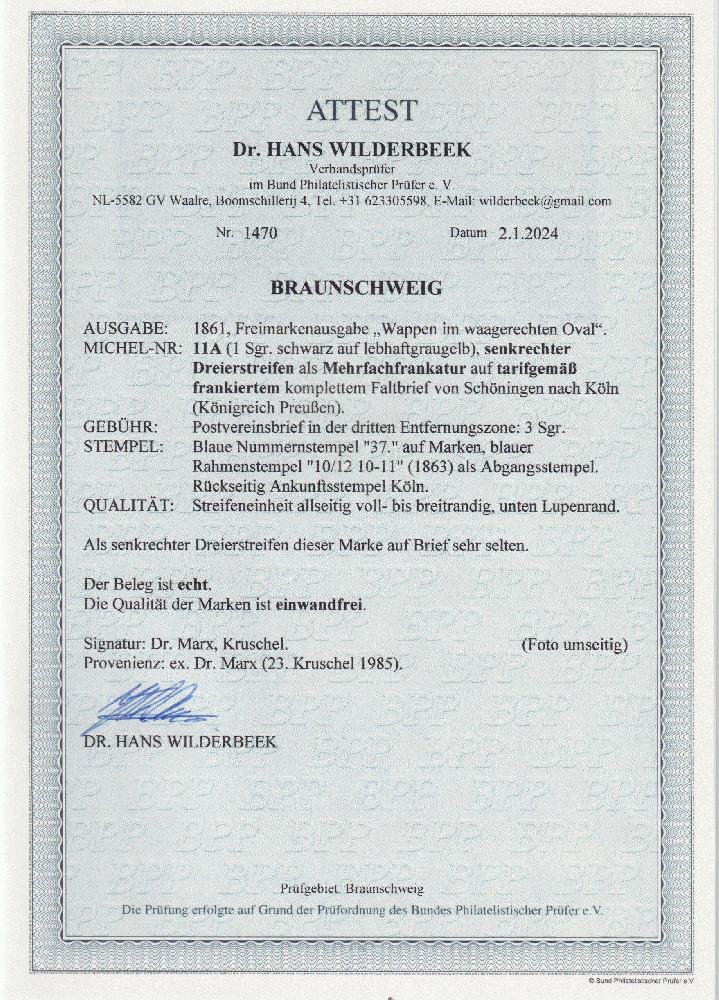 | Zusatzinformationen und Suchstichworte: | Südphila P. Feuser 101. Auktion 16. März 2024 Los 237 Altdeutschland Braunschweig 1 Sgr. a. gelb, senkr. Pracht-Dreierstreifen (unten Lupenrand) mit Stempel "37" Schöningen auf Brief nach Cöln Ausruf 300,00 EUR |