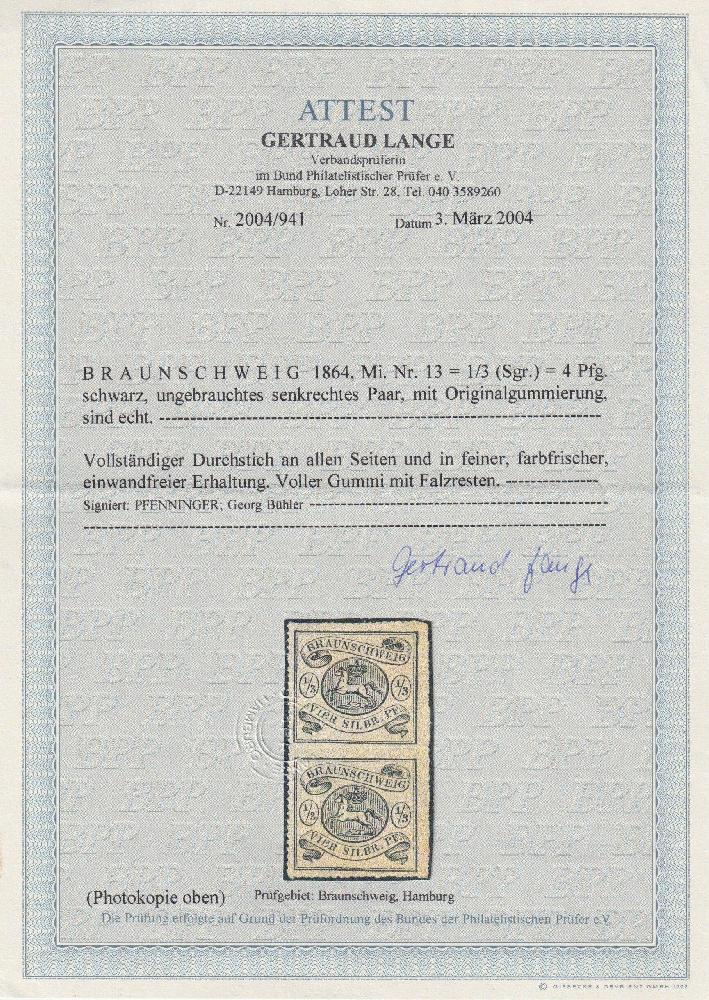 | Zusatzinformationen und Suchstichworte: | Südphila P. Feuser 101. Auktion 16. März 2024 Los 259 Altdeutschland Braunschweig 1/3 Sgr. schwarz, frisches ungebr. Kabinettpaar mit vollem Originalgummi, eine seltene Einheit Ausruf 500,00 EUR |