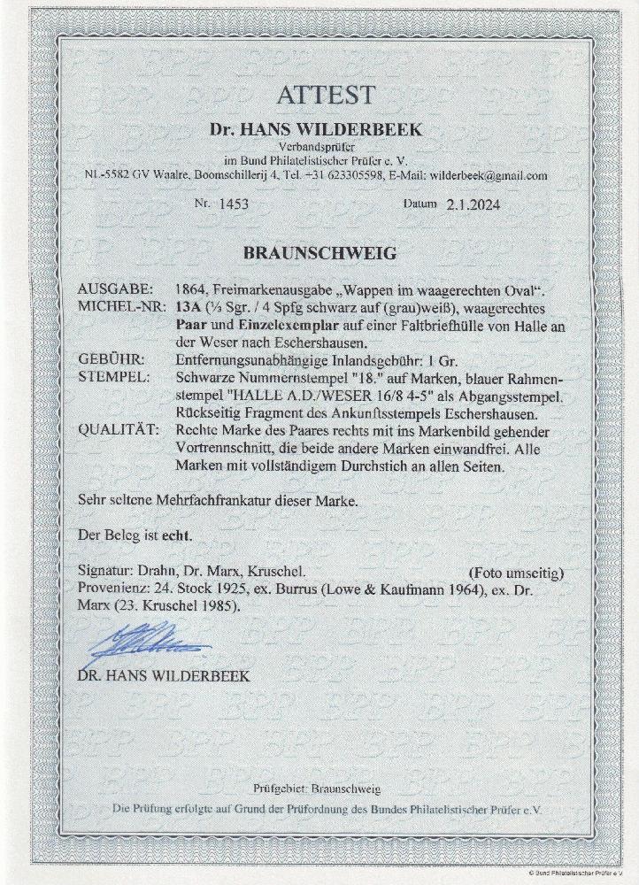 | Zusatzinformationen und Suchstichworte: | Südphila P. Feuser 101. Auktion 16. März 2024 Los 262 Altdeutschland Braunschweig 1/3 Sgr. schwarz, waagr. Paar (rechts kleiner Einschnitt) und Einzelstück in perfekter Erhaltung auf Brief mit Stempel "18" Halle a.d.Weser nach Eschershausen, eine sehr seltene Mehrfachfrankatur der Altdeutschland-Rarität Ausruf 4.000,00 EUR |