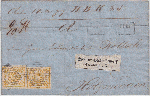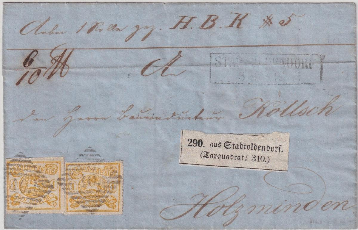 | Zusatzinformationen und Suchstichworte: | Südphila P. Feuser 101. Auktion 16. März 2024 Los 263 Altdeutschland Braunschweig 1 Sgr. gelb, bogenförmig durchstochen, zweimal (rechte Marke unten Durchstichfehler) mit klarem Stempel "40" Stadtoldendorf auf um 1/2 Sgr. überfrank. blauem Paketbegleitbrief (mit Taxquadrat-Aufkleber) nach Holzminden, ein sehr außergewöhnlich frankierter Fahrpostbeleg und seltene Mehrfachfrankatur Ausruf 600,00 EUR |