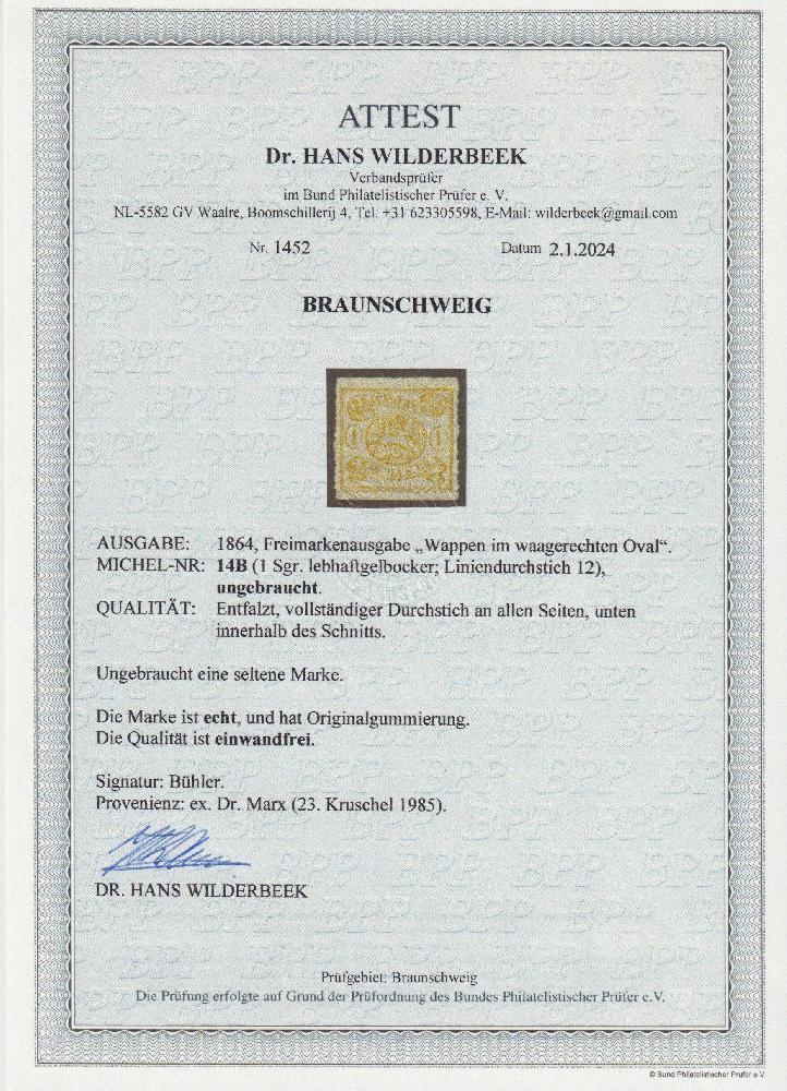 | Zusatzinformationen und Suchstichworte: | Südphila P. Feuser 101. Auktion 16. März 2024 Los 267 Altdeutschland Braunschweig 1 Sgr. gelb, ungebr. Kabinettstück mit vollem Durchstich, eine seltene Marke Ausruf 250,00 EUR |