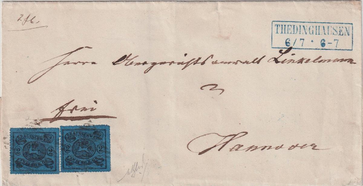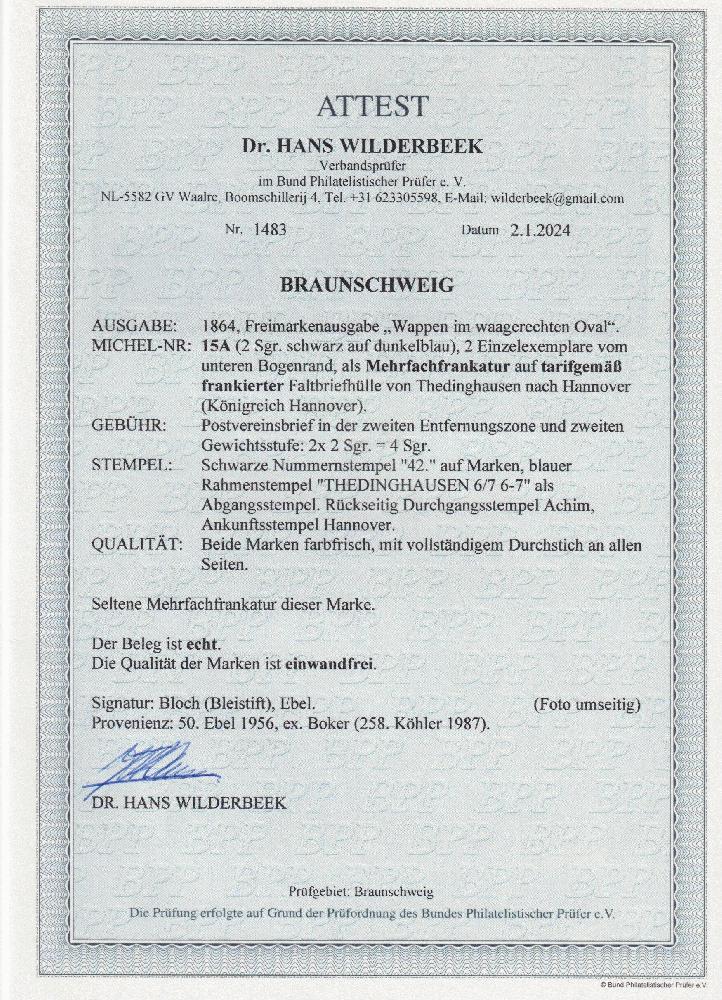 | Zusatzinformationen und Suchstichworte: | Südphila P. Feuser 101. Auktion 16. März 2024 Los 275 Altdeutschland Braunschweig 2 Sgr. a. blau, zwei Kabinettstücke mit Stempel "42" Thedinghausen auf Doppelbrief (aber hs. "2 Loth") nach Hannover, eine sehr seltene und schöne Mehrfachfrankatur Ausruf 1.000,00 EUR |